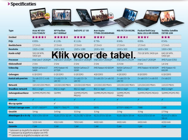 Steeds meer mensen kiezen voor een draagbare computer. Niet zo gek, want notebooks hebben een belangrijk voordeel ten opzichte van klassieke systemen. U kunt namelijk overal werken waar u maar wilt. Een desktopvervanger beschikt over een groot scherm en heeft genoeg rekenkracht om allerlei computertaken te verrichten, bijvoorbeeld foto's bewerken en HD-films kijken. Door de forse afmetingen en het relatief hoge gewicht zijn ze minder geschikt om er buitenshuis mee te sjouwen. Met name wanneer u op verschillende plekken in huis wilt computeren, zijn deze machines ideaal. Internetten vanaf uw bank in de woonkamer is goed mogelijk en als u achter een bureau werkt kunt u het scherm toch goed zien. Computerfabrikanten brengen om de haverklap verse modellen op de markt die zijn voorzien van de nieuwste hardwarecomponenten. Als u zich gaat verdiepen in de wereld van notebooks raakt u snel verdwaald. Daarom helpen we u graag een handje, en schotelen we u zeven interessante suggesties voor. We vroegen bij alle bekende computerfabrikanten 17inch-notebooks aan van maximaal 900 euro. De apparaten moeten natuurlijk wel een beetje betaalbaar zijn! Helaas hielden Dell en HP zich niet aan de voorgenomen prijsrange, want deze merken stuurden veel te dure producten op. Om toch een breed aanbod te presenteren, hebben we ze wel besproken in dit artikel. We letten om die reden extra op de prijs/kwaliteit-verhouding bij het aanwijzen van de testwinnaar. Uiteraard nemen we ook uitgebreid de specificaties, vormgeving en prestaties onder de loep.