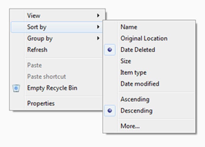 Als de zoekactie niets oplevert, kun je de Prullenbak openen die op je bureaublad staat en daarin naar het bestand zoeken. Als er een heleboel bestanden in de prullenbak staan kun je binnen het venster op de rechtermuisknop klikken en Sort by > Date Deleted kiezen. De bestanden die het laatst verwijderd zijn komen dan bovenaan in het venster te staan.