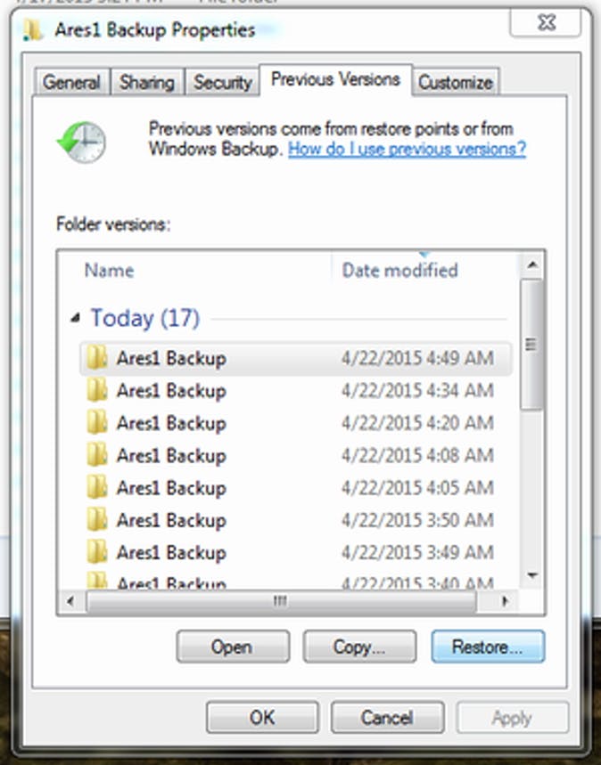 Als je bestand niet in de prullenbak staat en niet door Recuva teruggevonden kan worden, kun je het misschien eenvoudig vanaf een back-up herstellen. Windows 7 maakt automatisch "eerdere versies" van je bestanden aan, maar in Windows 8 moet je hiervoor de functie File History inschakelen. In Windows 7 open je de Verkenner en ga je naar de map waarin het bestand stond. Klik met de rechtermuisknop op de map en klik op Restore previous. Je krijgt dan een lijst met back-ups van de map te zien die gesorteerd is op datum. Klik op een back-up die aangemaakt was voordat je het bestand verwijderd had en klik op Restore.