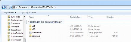 Office 2010 is de eerste editie van Microsoft Office waarvan een 64 bit-versie verschijnt. Deze versie kan worden gebruikt op iedere pc met een 64 bit-processor en een 64 bit-versie van Windows. Als u daarbij ook een 64 bit-versie van Office installeert, levert dat extra snelheid en stabiliteit op. Op een krachtige pc is Office 64 bit onverslaanbaar snel. Maar ook Office 32 bit is al sneller dan voorheen, dankzij de ondersteuning van processors met meerdere kernen. Daarbij komt dat niet alle invoegtoepassingen al in een 64 bit-versie beschikbaar zijn, nog los van de situatie waarbij u eerder een 32 bit-versie van een invoegtoepassing hebt gekocht en deze gewoon wilt blijven gebruiken. Die zal dan zeker niet werken in de 64 bit-versie van Office. Er zijn dus redenen genoeg om niet voor de 64 bit-versie te kiezen. Installeert u Office vanaf een cd, dan wordt standaard de 32 bit-versie geselecteerd. Om toch de 64 bit-versie te installeren, opent u de installatiedisk in Windows Verkenner. Ga vervolgens naar de map x64 en dubbelklik op setup.exe.