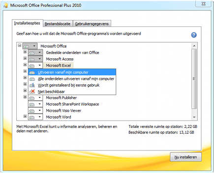 Wilt u bepaalde onderdelen van Office niet installeren of weet u dat een bepaald onderdeel standaard niet wordt geïnstalleerd terwijl u het wel op uw pc wilt hebben staan, kies dan na Aanpassen voor Installatieopties. Hier vindt u alle onderdelen van de Office-suite opgesomd, met achter ieder onderdeel een pull-downmenu. Door dat te openen kunt u van ieder onderdeel bepalen of u het wilt installeren (Uitvoeren vanaf mijn computer) of dat u het niet wilt installeren (Niet beschikbaar). Andere keuzes zijn 'Wordt geïnstalleerd bij eerste gebruik' waarbij de installatie wordt uitgevoerd zodra u het onderdeel van Office de eerste keer opstart en 'Alle onderdelen uitvoeren vanaf mijn computer' waarbij ook alle subfuncties en onderdelen van een programma direct op de pc komen te staan. Om een van die onderdelen te zien, klikt u op het Plus-teken voor het betreffende programma.