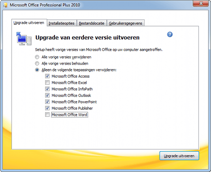 Ontdekt de installatie van Office 2010 dat er een eerdere versie van het pakket op uw computer staat, dan zal het standaard kiezen voor een upgrade. Daarbij raakt u alle oude programma's kwijt en u krijgt er alleen de nieuwe voor terug. Van sommige onderdelen van Office kunt u verschillende versies op uw computer naast elkaar gebruiken. Dat kan handig zijn wanneer u nog sjablonen, macro's of invoegtoepassingen hebt waarvan niet zeker is of en hoe ze onder de nieuwe Office-versie zullen werken. Kies in dat geval voor Aanpassen en geef vervolgens aan of u kiest voor Alle vorige versies verwijderen of juist voor Alle vorige versies behouden. Via Alleen de volgende toepassingen verwijderen kunt u individuele onderdelen van de al bestaande installatie aanmerken om ze te vervangen door 2010-versies. In alle andere gevallen wordt de nieuwe versie naast de oude gezet, zodat u beide kunt gebruiken.
