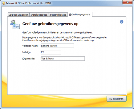 Het is handig om al tijdens de installatie de initialen van de gebruiker in te voegen. Deze staan dan automatisch in alle programma's en worden gebruikt als meta-informatie bij documenten die u maakt, voor het toevoegen van commentaar aan een document en bij andere reviewfuncties. Kies hiervoor bij de installatie van Office voor Gebruikersgegevens.
