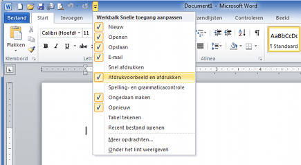 Tijdens de bètafase van Office 2007 bleek dat veel gebruikers naast het Lint toch graag een werkbalk hadden met de meest gebruikte functies. Dankzij het Lint was het namelijk niet altijd mogelijk om even op Opslaan te klikken of om een bestand te openen. Daarom bedacht Microsoft de werkbalk Snelle toegang, die op de verder toch ongebruikte Titelbalk ruimte creëerde om functies op te plaatsen. In Office 2010 is deze werkbalk natuurlijk gebleven en hij is onverminderd handig om er na de installatie naar eigen wens functies aan toe te voegen. Klik daartoe rechts van de standaardfuncties op de werkbalk op Werkbalk Snelle toegang aanpassen. Selecteer de functies die u op de lijst wilt hebben en verwijder functies die u toch niet gebruikt, door het vinkje ervoor weg te halen. Is alles naar wens, dan sluit u het menu door erbuiten te klikken.