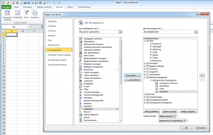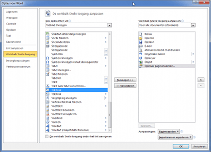 'Drag en drop' wordt helaas niet ondersteund bij het aanpassen van de werkbalk Snelle toegang. Toch is er wel een handigheidje dat het toevoegen en indelen versnelt. Wilt u een functie toevoegen, dan kunt u eerst in de lijst rechts de plek selecteren waar die functie op de werkbalk moet komen. Selecteer vervolgens in de linkerkolom de functie en klik op Toevoegen. De functie komt dan onder (!) de locatie terecht waar de muis in de rechterkolom staat.