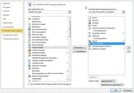 De mogelijkheden om de werkbalk Snelle toegang aan te passen gaan nog verder. Klik weer op Werkbalk Snelle toegang aanpassen en kies in het menu voor Meer opdrachten. Hier ziet u aan de rechterkant de functies op de werkbalk Snelle Toegang en links een overzicht van alle functies in de Office-applicatie die u nu hebt geopend. U kunt links iedere gewenste functie selecteren en hem dan via Toevoegen op de werkbalk Snelle toegang plaatsen. Via het drop-downmenu bij Kies opdrachten uit kunt u zoeken naar alle opdrachten binnen delen van het Lint, of een macro selecteren. Bent u tevreden met de aanpassingen, dan sluit u het menu via OK.