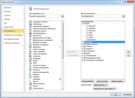 Net als bij de werkbalk Snelle toegang kunt u ook de plaatsing van de onderdelen van het Lint aanpassen, zodat ze nog beter toegankelijk zijn. Selecteer in de rechterkolom het betreffende onderdeel en bepaal via Omhoog of Omlaag hoever naar links of naar rechts op het Lint het onderdeel komt te staan.