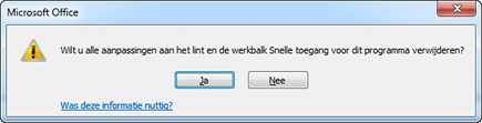 Is het aanpassen van het Lint niet goed gegaan en wilt u 'terug naar af', dan klikt u in het onderdeel Opties, Lint aanpassen op Beginwaarden en kiest u voor Alle aanpassingen opnieuw indelen. Dat is de cryptische omschrijving waarmee Microsoft bedoelt dat alle wijzigingen in het Lint ongedaan worden gemaakt, zodat u terugkeert bij het oorspronkelijke Lint. Bevestig de opmerking dat alle aanpassingen aan het Lint en (!) de werkbalk Snelle toegang ongedaan moeten worden gemaakt, door op Ja te klikken.