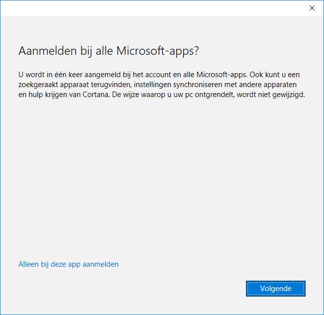 Let wel even op als je jezelf bij de Windows Store aanmeldt met je Microsoft-account om een app te kopen. Je krijgt namelijk een melding of je jezelf gelijk bij alle apps in Windows 10 met dit account wilt aanmelden. Klik je hier direct op de knop Volgende en niet op de (niet zo opvallende) link Alleen bij deze app aanmelden, dan wordt jouw Microsoft-account vanaf dat moment bij alle Microsoft-apps gebruikt. Erg onhandig: je kunt dat niet in één keer ongedaan maken. Je moet je stuk voor stuk via de menu-instelling van de desbetreffende app afmelden.