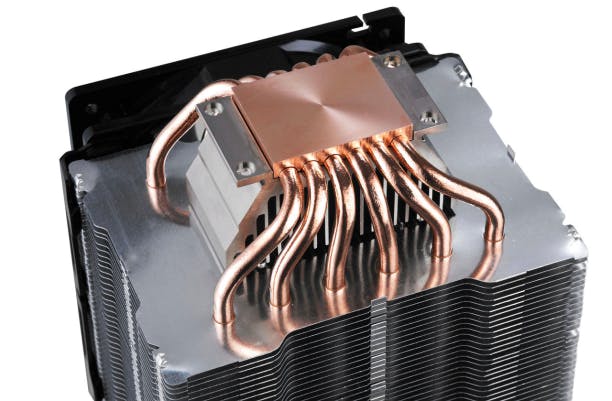 De zes heatpipes komen aan de onderkant samen in een koperen basisplaat.