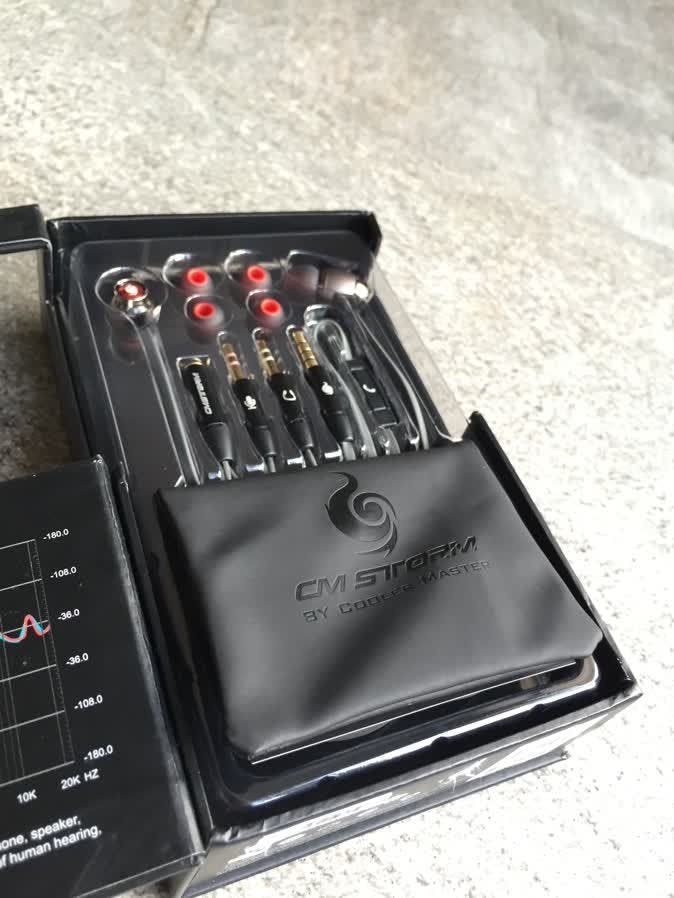De oortelefoon ziet er prachtig uit. De kleuren van het merk, zwart en rood, komen op veel onderdelen terug in het ontwerp van de oortelefoon. Niet alleen de kleuren representeren Cooler Master, op de achterkant van de oordopjes siert het logo wit op metallic rood. Alsof dat niet glossy was, zijn de uiteinden van de 3,5mm jack-kabels bedekt met een gouden kleur. Zelfs de uiteinden van de vliegtuigadapter zijn goudkleurig.