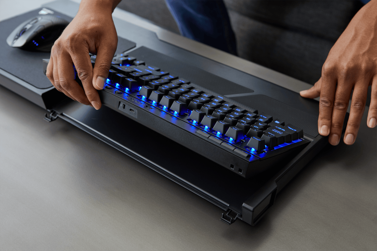 De combinatie mechanisch gaming toetsenbord en draadloos komt niet veel voor omdat gamers normaliter niet willen inleveren op ruwe invoersnelheid en verlichting; twee zaken die juist heel stevig op een accu wegen. De snelheid zit wel snor, maar hoewel Corsair wel heeft gekozen om (blauwe) verlichting in de toetsen te bouwen schakelden we dat vrij snel uit gezien er met de verlichting een kleine 20 uur accuduur over blijft, ten opzichte van een veel mooiere 75 uur zonder. Nog altijd genoeg voor een aantal avonden gamen, maar met een lastig te vervangen accu kiezen we voor behoud van de levensduur en schakelen we de verlichting liever uit.