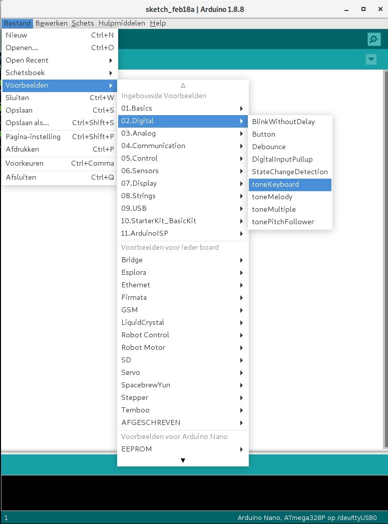 Na een tijdje weet je wel hoe zo’n include-opdracht er uitziet. Let op: zet die altijd helemaal in het begin van je schets. Van elke standaardbibliotheek vind je op de website van Arduino documentatie en voorbeeldcode. Die voorbeeldcode vind je ook in het menu Bestand / Voorbeelden.