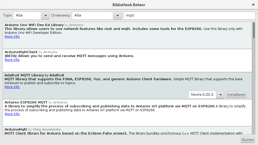 Voeg ze toe en bevestig je wijzigingen met OK. Open nu het bordbeheer opnieuw. Onderaan de lijst verschijnen nu de kernen esp32 van Espressif Systems en esp8266 van ESP8266 Community. Installeer je deze kernen, dan zijn de ondersteunde bordjes zoals de NodeMCU daarna beschikbaar in de lijst in het menu Hulpmiddelen / Board. Kies je bordje, kies de instellingen zoals de poort en uploadsnelheid en je kunt je schets naar je bordje uploaden.