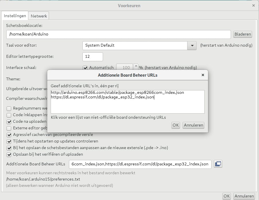De kernen die je in het bordbeheer vindt, zijn niet de enige. Je kunt bijvoorbeeld zelf ondersteuning voor de populaire microchips ESP8266 of ESP32 toevoegen. Klik je in het menu Bestand op Voorkeuren, dan zie je onderaan een tekstveld Additionele Board Beheer URLs. Hier kun je een url voor extra bordondersteuning invullen. De url’s voor de ESP8266 en ESP32 zijn respectievelijk: