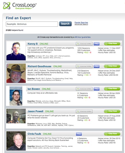 Via het raderknopje op de tabbladen van CrossLoop komt u bij de functie Zoek Helper. Op die manier belandt u op de website met profielen, waar u door middel van een zoekfunctie de expert vindt voor de materie waarmee u in de knoop zit. In de Advanced Search Options op de site zult u zelfs een heleboel Nederlandstalige experts aantreffen. Bij ieder profiel leest u hoeveel hulpsessies iedere expert achter de rug heeft en hoe hoog zijn of haar waardering is. Deze mensen doen dit niet gratis. Bij ieder profiel leest u de prijs van deze bijstand, waarop CrossLoop trouwens commissie pakt. Dit brengt u misschien op het idee om uzelf in te tekenen als expert, zodat u dan toch iets meer overhoudt dan de volgende fles wijn waarop uw dankbare vrienden u meestal trakteren.