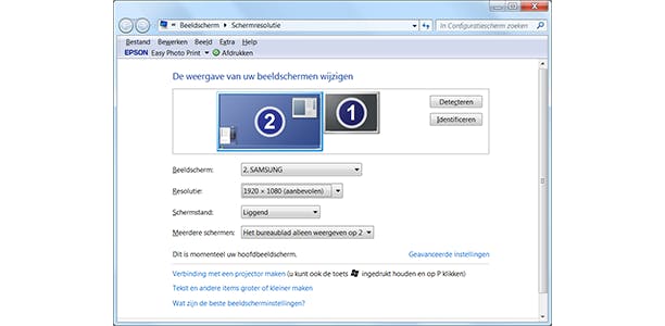 Als je computer verbonden is met je televisie, is het soms nog nodig dat je handmatig de juiste resolutie kiest. Klik met de rechtermuisknop ergens op het bureaublad en open het onderdeel Schermresolutie. Verander zo nodig de waarde achter Resolutie en controleer via Toepassen het beeld. Wellicht heb je de televisie als tweede scherm op het systeem aangesloten. Dat is bijvoorbeeld het geval wanneer je een laptop als HTPC gebruikt. Je stelt bij de optie Meerdere schermen eenvoudig in dat je het beeld op de tweede monitor wilt weergeven. Lijkt het je handig om snel tussen verschillende schermen te switchen? Druk dan op Windows-toets+P.