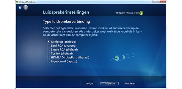 Je past de instellingen van Windows Media Center naar eigen wens aan. Ga naar Taken / Instellingen / Luidsprekers instellen. Doorloop alle stappen om aan te geven hoeveel luidsprekers je op de pc hebt aangesloten en welke aansluiting je daarvoor gebruikt.