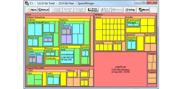 Met het programma SpaceMonger is snel te zien waar de grootste bestanden zich bevinden.