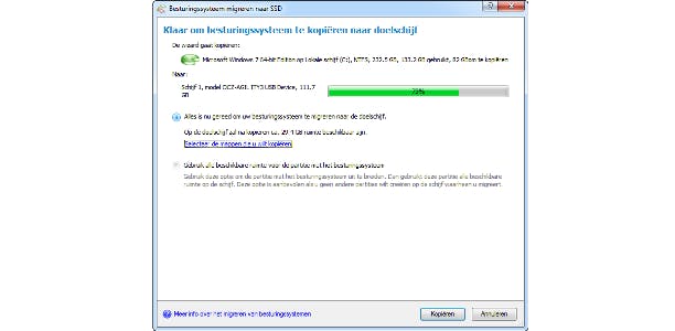 Hier kan worden aangeven welke mappen je wilt kopiëren en welke niet mee hoeven naar de SSD. Sluit bijvoorbeeld de mappen als Downloads, Afbeeldingen, Muziek, Video’s en Mijn documenten uit en probeer het opnieuw. Mocht dat niet baten, probeer dan stap een tot en met vijf van dit artikel nog eens door te lopen. Zodra de capaciteit goed is, kan het migreren echt beginnen. Kies na het berekenen van de kopiegrootte eventueel voor de optie om alle ruimte op de SSD te gebruiken voor het besturingssysteem en klik op de knop Kopiëren.