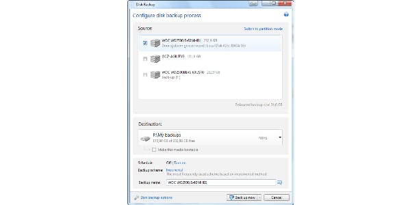 Met True Image is het helaas niet mogelijk om mappen en bestanden uit te sluiten van de migratie. Zorg er daarom voor dat de data op de harde schijf of partitie, minder groot is dan de omvang van de SSD. Start True Image 2013 en open het tabblad Backup and recovery. Klik op de knop Disk and partition backup en kies bovenin voor Switch to disk mode. Selecteer de harde schijf die je wilt migreren en geef bij Destination de locatie op waar je het back-upbestand naartoe wilt kopiëren.