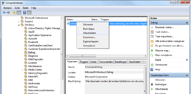 Gebruik je alleen een SSD, dan is het verstandig defragmentatie helemaal uit te schakelen. Een SSD gebruikt een geheel andere techniek en heeft absoluut geen defragmentatie nodig, het is zelfs slecht voor de levensduur van de schijf. Open menu Start, klik met de rechtermuisknop op Computer en kies Beheren. Ga naar Systeemwerkset / Taakplanner / Microsoft / Windows / Defrag, klik met de rechtermuisknop op ScheduledDefrag en kies Uitschakelen.