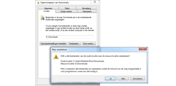 Open het tabblad Locatie en klik op de knop Verplaatsen. Selecteer de plek waar je de map naartoe wilt verplaatsen (via de knop Nieuwe map, kun je eventueel een nieuwe map maken) en klik op de knop Map selecteren. Druk op de knop Toepassen, lees de waarschuwing en klik op Ja om de map te verplaatsen. Herhaal dit voor alle mappen die je wilt verplaatsen.