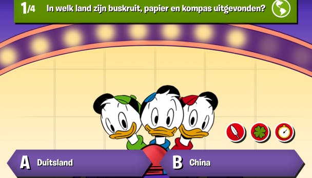 Zoek je een quiz om samen met je (klein)kind te spelen? Duck Quiz behandelt in een speelse gebruikersomgeving vragen voor volwassenen en kinderen vanaf acht jaar. Vragen die aan bod komen gaan onder meer over aardrijkskunde, dieren, geschiedenis en natuurlijk Donald Duck. Iedere speler kiest zijn favoriete Duckstad-personage, waarna het spel kan beginnen. Kinderen doen iedere ronde desgewenst een beroep op drie hulplijnen om vragen te beantwoorden. Duck Quiz is geschikt voor maximaal vier spelers.
