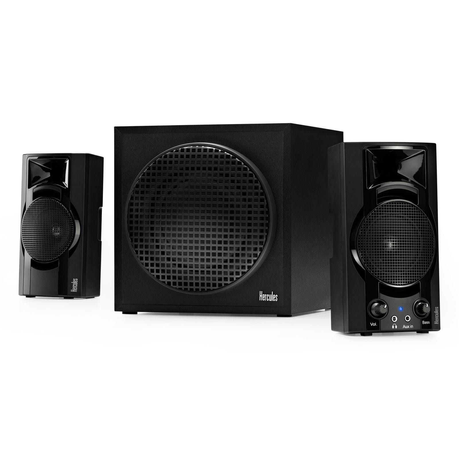 Met een prijs zo rond de vijftig euro, behoren deze speakers van Hercules tot de goedkoopste in de test. Dat is er ook wel aan af te zien: de satellietspeakers zijn gemaakt van glimmend, dun plastic en wegen vrijwel niets. Het subwoofertje komt in elk geval wat degelijker over. De rechterspeaker zit vast aan de subwoofer, de linker moet je apart inprikken. De audiokabel van deze set zit ook vast aan de subwoofer. De plaatsingsmogelijkheden zijn hierdoor beperkt. Op een van de satellieten zitten een aux-ingang en een hoofdtelefoonaansluiting, evenals de volume- en basregeling.
