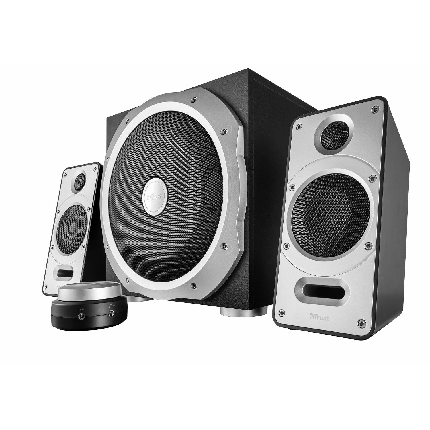 De set van Trust kom je veel in de winkel tegen. Het lijkt een goede deal, twee redelijk aanvoelende tweewegsatellieten en een imposante subwoofer met een geclaimd vermogen van 120 watt. De praktijk valt anders uit. De tweeter op de satellieten blijkt niets anders dan een in het plastic gestanst patroon, er is maar één driver in aanwezig. De Byron is functioneel identiek aan de goedkopere, ook nog verkrijgbare Tytan van het merk. Ook hier treffen we een aux-ingang en een hoofdtelefoon op de bedrade afstandsbediening. Het geluid is ondermaats. Vocalen klinken dof, bijna alsof je ze onder water hoort. Er is vrijwel geen definitie, waardoor individuele instrumenten niet te plaatsen zijn en de bas is ongecontroleerd. Bij hogere volumes in het laag gaat de subwoofer bonken. Voor de helft van de prijs zouden we al niet enthousiast zijn, maar bij de vraagprijs van negentig euro kunnen we de Byron alleen maar afraden.