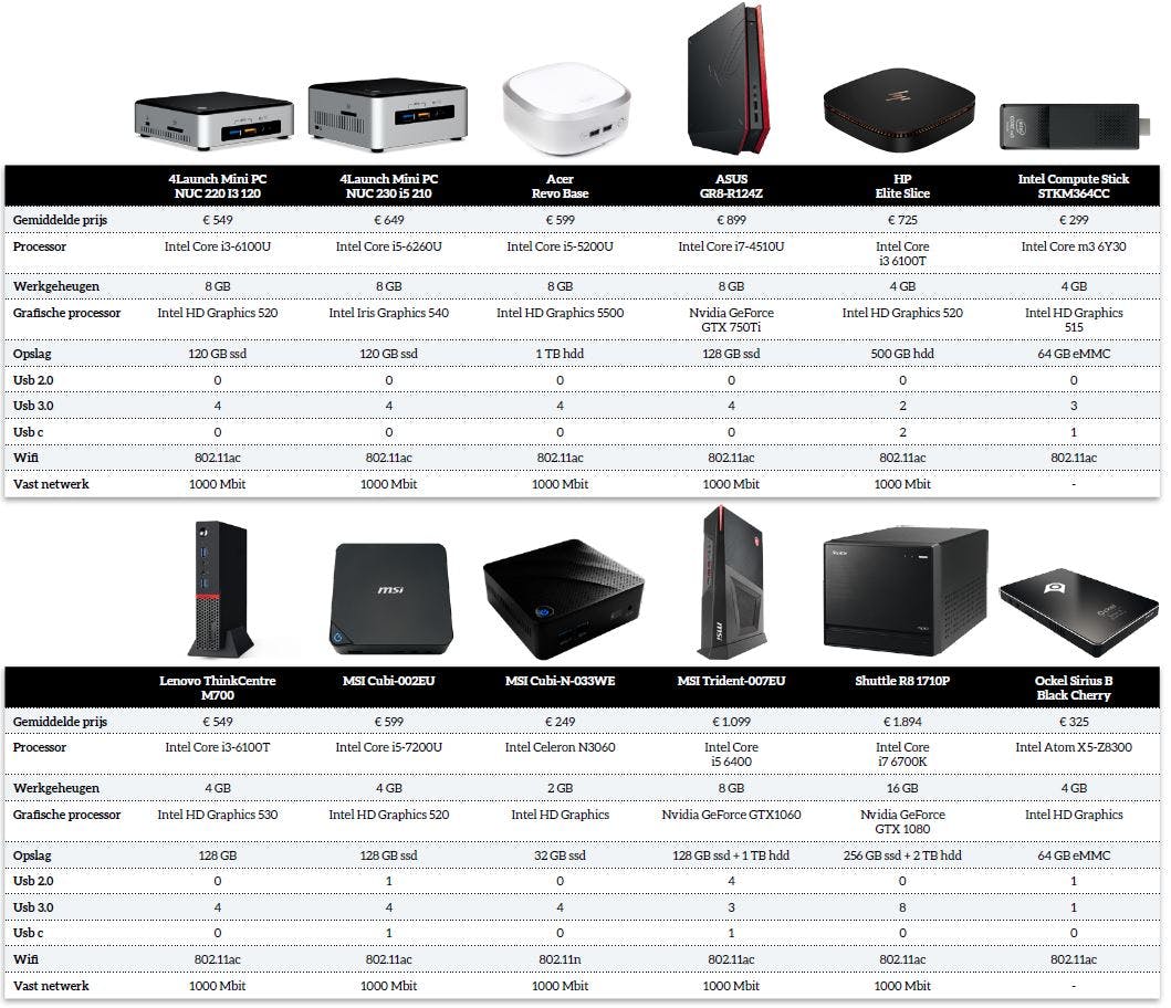 Mini-pc’s zijn er in variërende prijsklassen en voor allerlei verschillende doeleinden. Voor minder dan 300 euro heb je een prima school- of kantoormachientje dat je zo achter je monitor kunt wegwerken. Maar we hebben ook gezien dat mini-pc’s geen minimalistische specificaties hoeven te hebben. Geef je wat meer uit, dan komt zelfs lekker gamen binnen bereik. De meest krachtige komt van Shuttle en dat is de R8 1710GA, dat is een superkrachtige machine, die zelfs voor de zwaarste taken en games geschikt is. Kijken we echter ook even met onze portemonnee, dan komt de ASUS GR8 er ook goed uit. Die kost slechts 899 euro en heeft toch best wat grafische kracht aan boord, dankzij de GTX 750Ti. De ideale en toch redelijk betaalbare mini-pc om mee te gamen is de MSI Trident. Wil je een lekkere mediaspeler, dan is de Intel Compute Stick met Core M prima voor een gewone hd-tv. Mits je je niet ergert aan de fan, want dan kun je beter shoppen bij Ockel. Heb je nog wat meer power nodig, voor je 4K-tv bijvoorbeeld, kies dan de Cubi 2 van MSI met zijn gloednieuwe i7 aan boord.