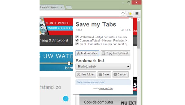 Als je veel tabbladen open hebt staan, is het lastig om zomaar bij je computer weg te lopen of het apparaat af te sluiten. Dankzij Save my Tabs kan dit wel. Klik op de extensie en bewaar al je tabbladen in één keer met Save. Save my Tabs bewaart alle geopende tabbladen als bladwijzers. Maak eventueel eerst een aparte map aan, bijvoorbeeld met de datum van vandaag.