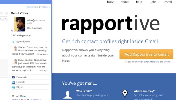 Rapportive is een informatiehulpje voor Gmail. De uitbreiding toont aan de rechterkant van je scherm informatie over de persoon met wie je mailt. De gegevens zijn niet alleen afkomstig uit je persoonlijke adresboek, maar ook live van sociale media als Facebook en LinkedIn.
