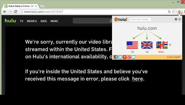 Met de extensie Hola los je dit eenvoudig op! Na installatie bezoek je de website waar de toegang wordt gewijzigd. Klik op het Hola-icoontje en kies een landvlaggetje. We zullen je de technische verhandeling besparen, het eindresultaat is het belangrijkste: de inhoud wordt nu wel getoond.