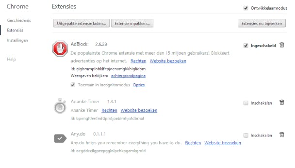 Schakel extensies (tijdelijk) uit of klik op de prullenbak om een extensie te verwijderen.