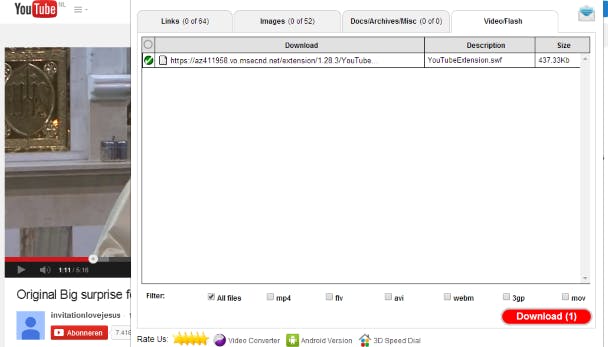 GetThemAll herkent en ondersteunt alle bekende indelingen, zoals png, jpg, zip, rar, exe, avi, mp4 en veel meer. Omdat veel websites een overvloed aan afbeeldingen en andere elementen bevatten, heeft GetThemAll handige filters. Deze vind je in de tabbladen. Als je bijvoorbeeld een YouTube-filmpje wilt binnenhalen, klik je op de GetThemAll-knop en vervolgens het tabblad Video Flash.