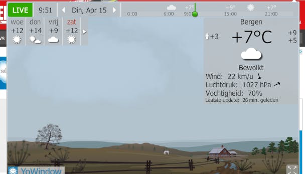 Er wordt veel gesproken over het weer en er zijn talloze programma's die hier op in spelen. YoWindow is al enige tijd onze favoriet en is nu ook beschikbaar als uitbreiding voor Chrome. Het YoWindow-icoontje toont een minimalistische weergave van het actuele weer met hier in de temperatuur en een wolk (of zonnetje). Klik op het YoWindow-icoontje voor een weeranimatie. Je ziet bijvoorbeeld een landschapje waarin het regent of de zon schijnt. Als de bomen bewegen, weet je dat het waait. Boven in beeld kun je via een tijdlijn terug in de tijd gaan of de weersverwachting voor de aankomende dagen bekijken. Uiteraard wordt de temperatuur, windsnelheid, luchtvochtigheid en meer getoond.
