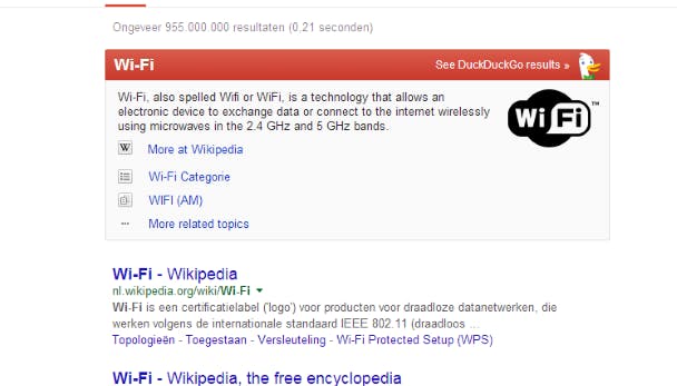 Dit is echter niet de kracht van de uitbreiding, je kunt immers net zo goed www.duckduckgo.com bezoeken! De DuckDuckGo-extensie integreert ook in de zoekmachine die je nu al gebruikt. Als je via bijvoorbeeld www.bing.com of www.google.com ergens naar zoekt, krijg je (indien van toepassing) boven je zoekresultaten een venstertje van DuckDuckGo 'hints' over het onderwerp waarnaar je zoekt. Dankzij de uitbreiding zoek je dus eigenlijk altijd op twee plekken tegelijk: je favoriete zoekmachine (bijvoorbeeld Google) en de 'onafhankelijke pure' zoekmachine van DuckDuckGo.