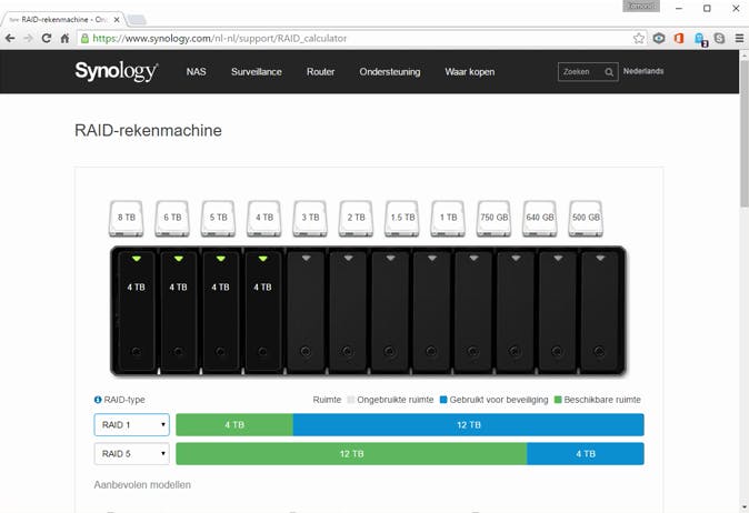 De online RAID-calculator van Synology laat direct zien hoeveel opslagruimte je overhoudt bij verschillende schijf- en RAID-configuraties.