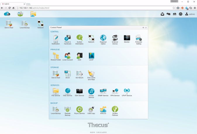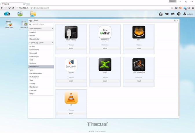 Thecus geeft hoog op over de N2810, want het model heeft nieuwe hardware, een sterke processor én is de eerste met het nieuwe ThecusOS 7-besturingssysteem. Desondanks is juist dat besturingssysteem opnieuw het probleem, het is gewoon weer niet af en de vernieuwing te beperkt. Open je bijvoorbeeld een onderdeel in het 'nieuwe' configuratiescherm, dan ben je direct weer terug in het oude configuratiescherm en hoef je nooit meer terug naar het nieuwe configuratiescherm. Er is een redelijk groot aanbod aan packages, maar deze zijn wel bijna zonder uitzondering niet van Thecus zelf en vereisen beduidend meer kennis en inspanning om aan de praat te krijgen dan bij de andere NAS-merken. Vind je dat nou net leuk en heb je liever een wat 'open' apparaat waar je zelf veel kunt doen, dan is dat Thecus juist de goede keuze. Ook de N2810 beschikt over een HDMI-poort en de mogelijkheid de NAS als mediaspeler in te zetten. Thecus gebruikt onder andere Kodi en XBMC.