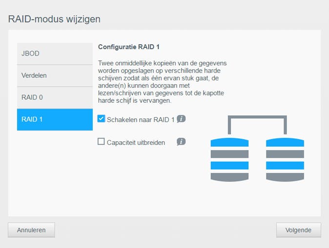Er zijn meerdere mogelijkheden bij RAID, aangeduid met niveaus. Heb je een NAS met twee schijven, dan kun je RAID1 configureren. Daarbij slaat de NAS alle gegevens twee keer op, één keer op de ene schijf en één keer op de andere. De twee schijven zijn dan letterlijk een kopie van elkaar.