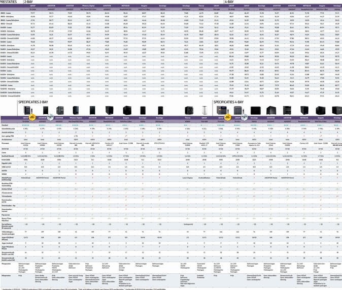 Als opslag werden Seagate NAS-schijven van 2 TB gebruikt. Deze schijven zijn voorzien van speciale firmware om jarenlang betrouwbaar en toch bovengemiddeld belast te worden en zijn daarmee bij uitstek geschikt voor gebruik in een NAS. De enige uitzondering is de WD MyCloud EX2 Ultra, die is getest met de bijbehorende standaard WD Red-schijven. Tijdens de configuratie en test van RAID1 is ook het stroomverbruik onder belasting en in rust gemeten. Alle gegevens van de verschillende tests zijn terug te vinden in de tabellen bij dit artikel. Daarin ook een overzicht van de belangrijkste functies en bijbehorende opties zoals het aantal packages en apps. In het tijdschrift vind je een selectie uit de tabel, de volledige tabel vind je online.
