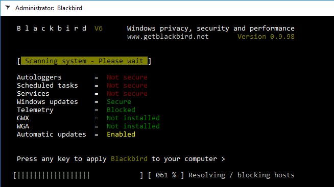 Je kent misschien wel zo’n nors persoon in je omgeving: je vraagt iets, krijgt een snauw en het wordt geregeld. Dit is ongeveer wat Blackbird doet met de privacyinstellingen van Windows 10. Blackbird weet welke onderdelen ongewenst zijn en draait deze vakkundig de nek om. Er zijn geen opties, Blackbird doet wat er gedaan moet worden. In de meeste gevallen moeten we Blackbird gelijk geven. Veel aanpassingen zijn te technisch voor een normale sterveling om te begrijpen en dan kun je het beter aan een expert overlaten. Zo wordt de functie Wi-Fi sense uitgeschakeld en dat geldt ook voor Cortana, Bing-integratie, locatiebepaling, het verzamelen/doorsturen van metadata en het delen van Windows Updates met andere computers. Zelfs OneDrive moet eraan geloven. Dit is slechts een greep uit de wijzigingen die Blackbird voor je doorvoert. Hoewel iedereen Blackbird kan bedienen, heeft het programma een hoge moeilijkheidsgraad. Je moet namelijk weten hoe je dos-commando’s uitvoert als je aanpassingen ongedaan wilt maken. De documentatie is goed (lees vooral de readme.txt!), elke expert kan de dos-opdrachten uitvoeren om bijvoorbeeld OneDrive weer te activeren als je dit onderdeel toch wel wilt gebruiken. Maak voordat je met Blackbird aan de slag gaat eerst een systeemherstelpunt.