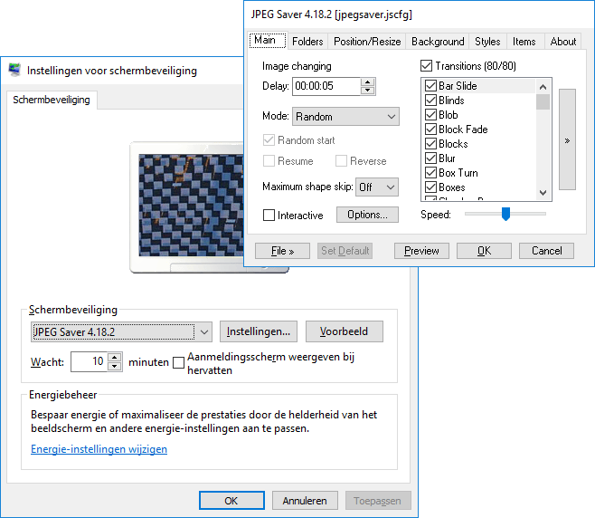 Alle Windows-versies hebben een simpele schermbeveiliging aan boord waarmee je je eigen foto’s kunt tonen als je je computer een paar minuten gebruikt. JPEG Saver biedt deze mogelijkheid ook, maar dan veel uitgebreider. Je kunt meerdere mappen kiezen waaruit je foto’s wilt zien. Ook voor mensen met meerdere monitors zijn er handige opties te vinden en je kunt extra elementen (zoals een klok) op je foto’s laten zien. Elke foto wordt automatisch gewisseld met een speciaal effect. Voor een vliegende start ga je in Windows 10 naar Instellingen (Windows-toets+I) / Persoonlijke instellingen / Vergrendelingsscherm / Instellingen voor schermbeveiliging. Selecteer JPEG Saver als schermbeveiliging en klik op Instellingen. Geef bij Folders op waar je foto’s te vinden zijn. Verander bij Main de vertraging van de diashow (bijvoorbeeld naar vijf seconden), en kies bij Mode voor Random om je foto’s in willekeurige volgorde weer te geven. Bekijk een voorbeeldweergave met de knop Preview.