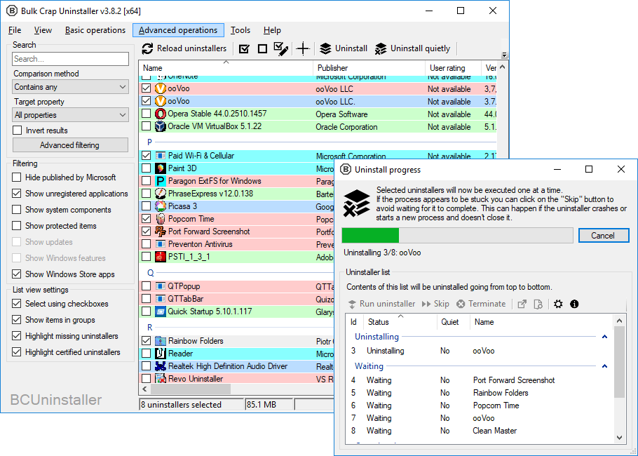 BCUninstaller staat voor ‘Bulk Crap Uninstaller’ en daarmee is alles gezegd. Het programma maakt het eenvoudig om meerdere programma’s snel te verwijderen van je computer. Plaats links in beeld een vinkje bij Select using checkboxes. Hiermee wordt het mogelijk om meerdere programma’s aan te vinken die je wilt verwijderen. Dit scheelt veel tijd ten opzichte van de standaardprocedure van Windows. BCUninstaller toont een lijst met alle programma’s die aanwezig zijn op je computer. Vink de programma’s aan die je wilt verwijderen. Ook de apps van de Windows Store (Windows 10) zijn zichtbaar. Klik op Uninstall om BCUninstaller aan het werk te zetten. Het programma vraagt om een herstelpunt aan te maken: dit is altijd verstandig! Vervolgens worden alle de-installatieprocedures automatisch in gang gezet. BCUninstaller gebruikt hiervoor de standaardprocedure die werd meegeleverd met het programma dat je probeert te verwijderen. Als deze ontbreekt of defect is, helpt BCUninstaller je om de mappen, bestanden en andere resten handmatig te verwijderen.