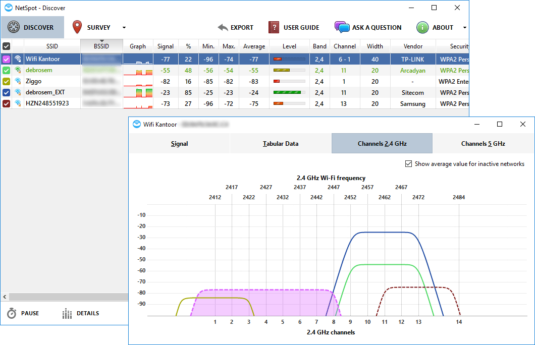 NetSpot helpt bij het visualiseren van je wifi-netwerk. Vooral de betaalde (en veel te dure!) Pro-versie kan je wifi-signaal letterlijk binnenshuis in kaart brengen. De gratis versie is beperkter, maar heeft biedt nog steeds veel handige functies om je wifi te verbeteren. Voorheen was inSSIDer ons favoriete programma om alle netwerken in de buurt te visualiseren, maar inSSIDer is helaas niet meer gratis. Met NetSpot Free kun je hetzelfde: de technische details van draadloze netwerken binnen je bereik bekijken. Je ziet de verbindingsmogelijkheden van je draadloze toegangspunt (802.11b/g/n etc.). Belangrijker om te weten is de sterkte waarmee je wifi -signaal ontvangt en de kanaalkeuze. Als je wifi steeds wegvalt, kun je terwijl je NetSpot Free open hebt je toegangspunt (of computer) verplaatsen om het bereik te optimaliseren. De kanaalkeuze zie je in een grafiek, ook van netwerken waarmee je niet verbonden bent. Zo zie je snel of het netwerk van de buren jouw netwerk (en omgekeerd) mogelijk stoort. Met deze kennis kun je je wifi -kanaal aanpassen (niet voor beginners!) in je wifi -modem of draadloos toegangspunt naar een ‘rustiger’ kanaal.