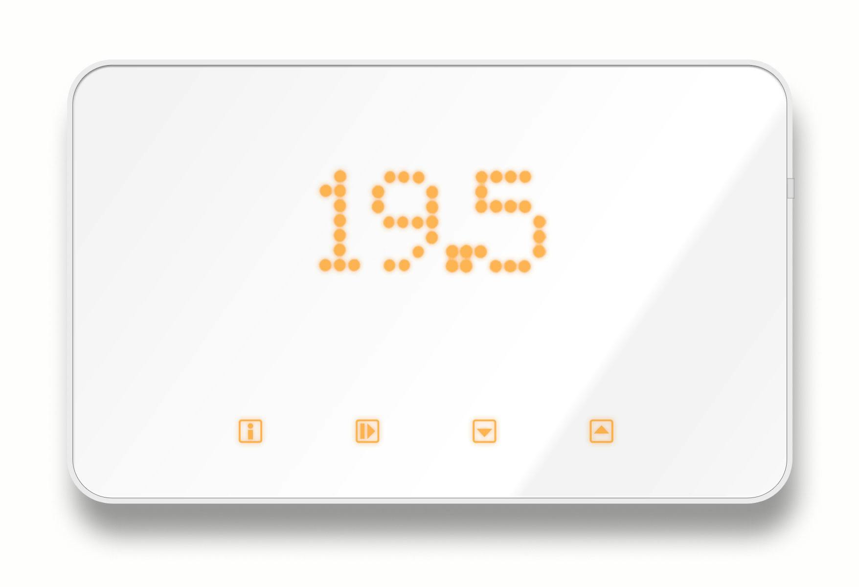 voorgangers, al is nu ook de rand wit en is de voorkant van gehard glas in plaats van kunststof. Met statisch folie kun je een eigen ontwerp maken, een code voor een gratis exemplaar wordt meegeleverd. Nog steeds toont de voorkant in oranje cijfers de huidige temperatuur en als alternatief kun je niets of de tijd tonen. Voor het aansluiten gebruik je een ketelmodule. Om hem te installeren, maak je via wifi verbinding met de ThermoSmart, waarna je het wachtwoord van je draadloze netwerk opgeeft.