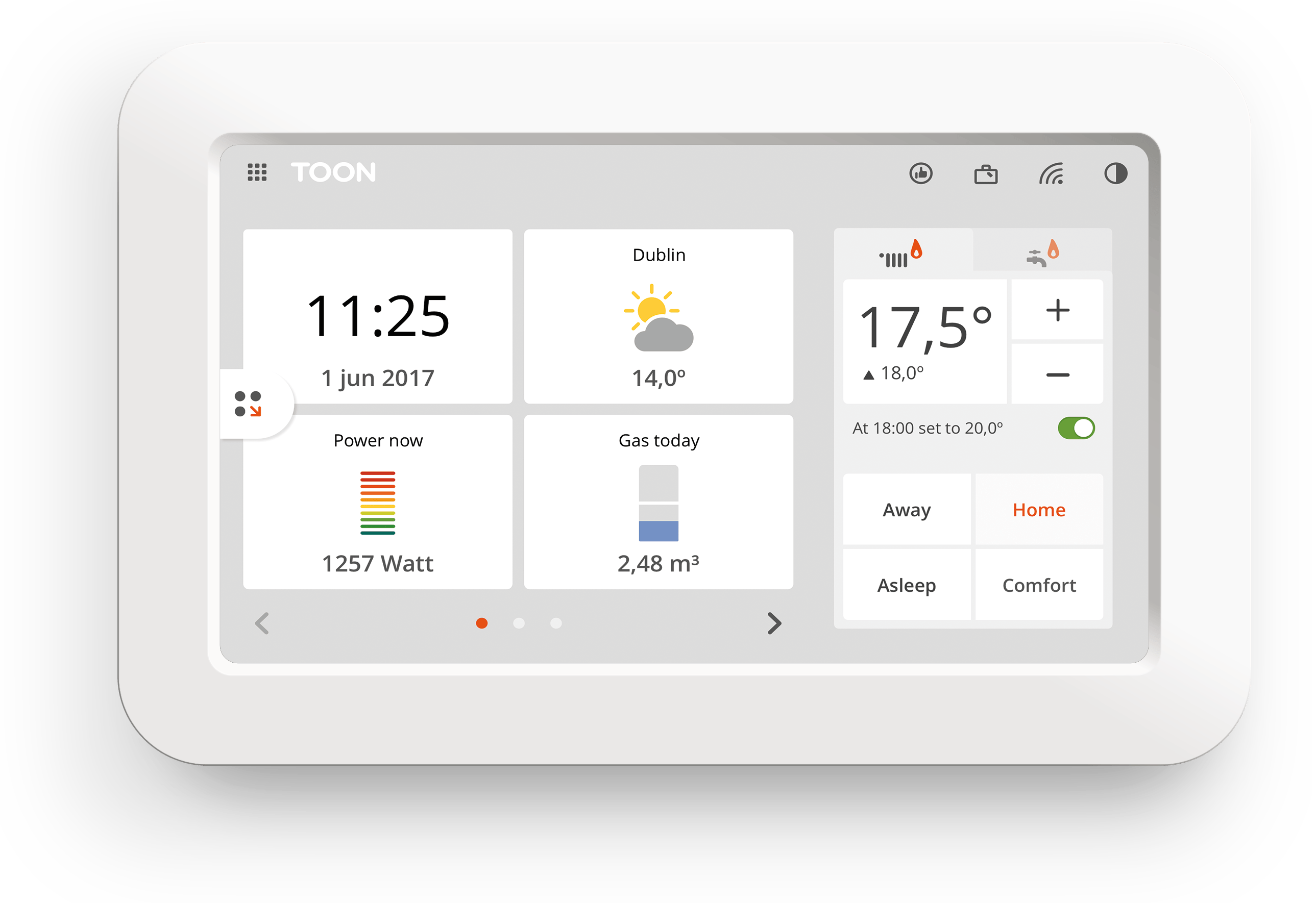 Met een afmeting van 19 bij 12 cm is de Toon een enorme thermostaat. Toon heeft dan ook een 7inch-aanraakscherm waarop informatie als je energieverbruik, het weerbericht en uiteraard de temperatuur getoond wordt. Toon werkt net als de meeste andere slimme thermostaten met een ketelmodule die de Toon van energie voorziet. Daarnaast krijg je een module voor in de meterkast die je aansluit op je slimme meter of via meegeleverde sensoren op oudere niet slimme energiemeters. Hierdoor kun je met Toon je huidige en historische energieverbruik zien. Bij aankoop van Toon krijg je de installatie door een monteur er overigens bij.