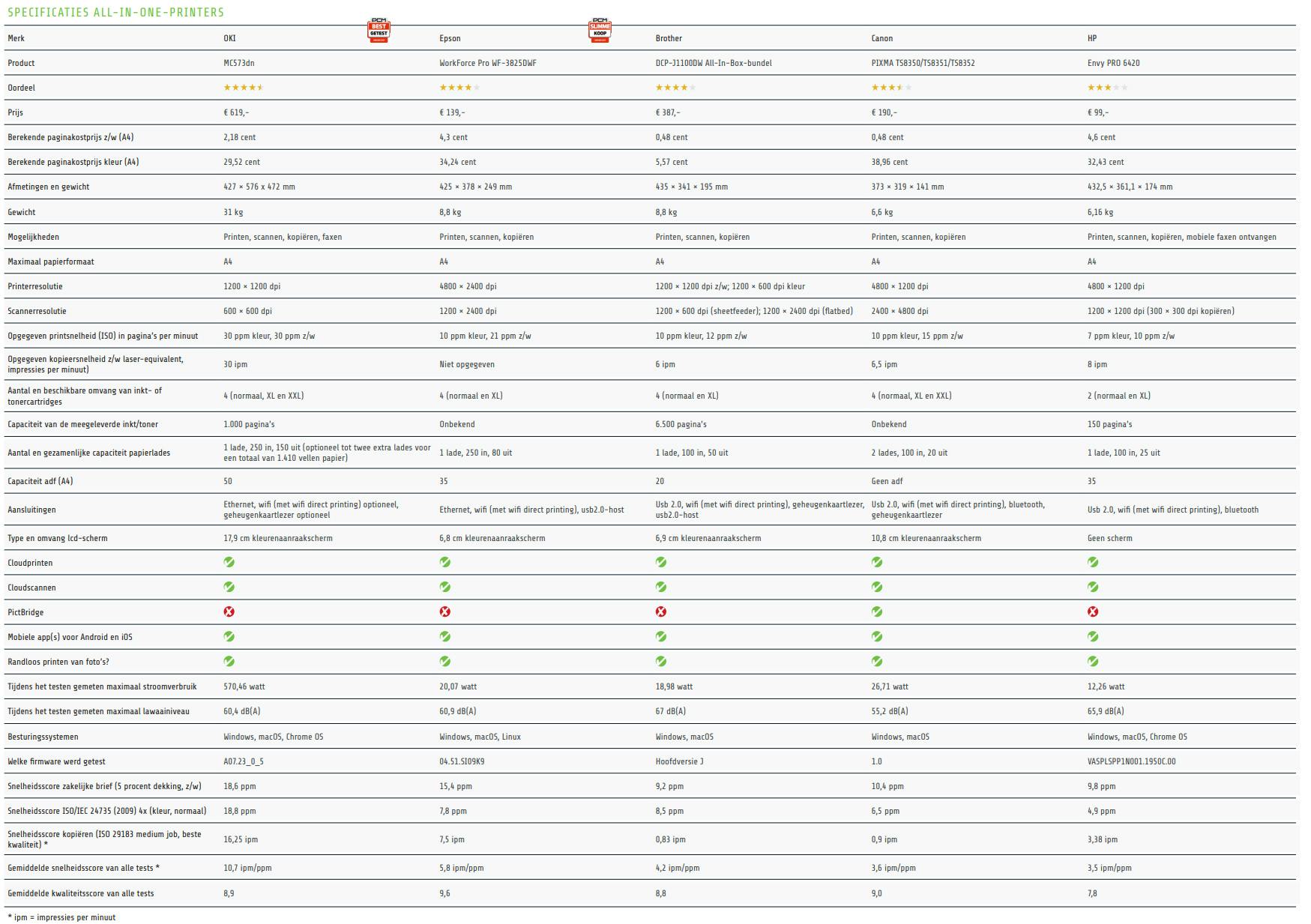 We vroegen fabrikanten om een zo compact mogelijke multifunctionele netwerkprinter voor thuis(kantoor) en kleine werkgroepen. Het maakt niet uit welke printtechniek de ingestuurde alles-in-éénprinter gebruikt; sommige fabrikanten hebben uitsluitend inkjetprinters, anderen zweren bij (led)laserprinters en sommige bedrijven bieden beide technieken aan. We ontvingen vier A4-inkjetprinters (van Brother, Canon, Epson en HP) en één A4-ledlaserprinter (van OKI).