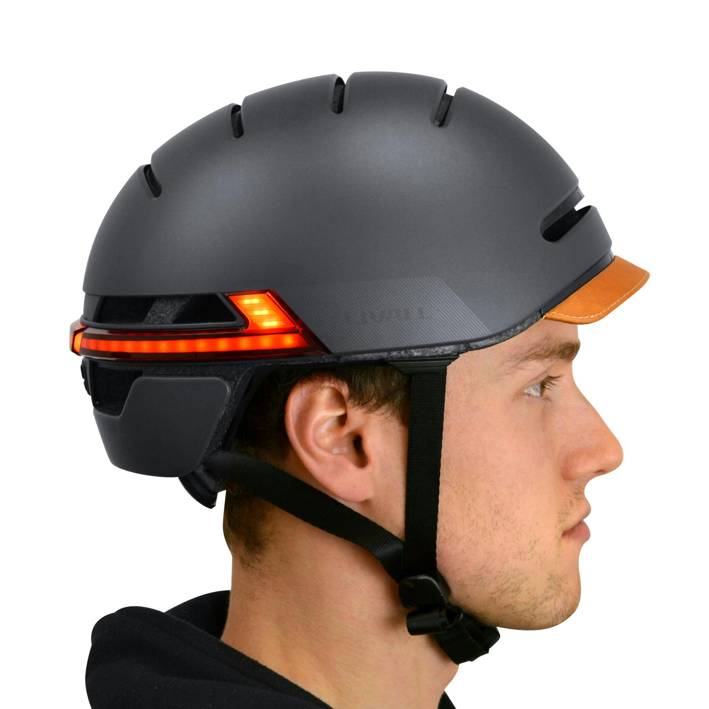 De ingebouwde schoksensor in de helm activeert bij een val een rood waarschuwingslicht
